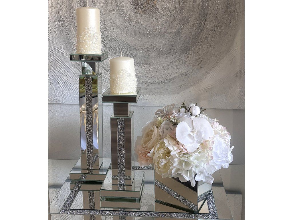 Zrkadlový podklad odráža svetlo aj samotné kvety, čím dodáva aranžmánu hĺbku a exkluzívny vzhľad.