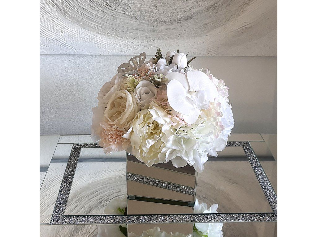 Tento elegantný aranžmán v jemných bielo-krémových tónoch pôsobí luxusne, sviežo a zároveň veľmi vkusne. Zdobený strieborným motýlom. Kombinácia realistických umelých kvetov a zrkadlovej krabičky vytvára výrazný dekoratívny prvok, ktorý okamžite pritiahne pozornosť.