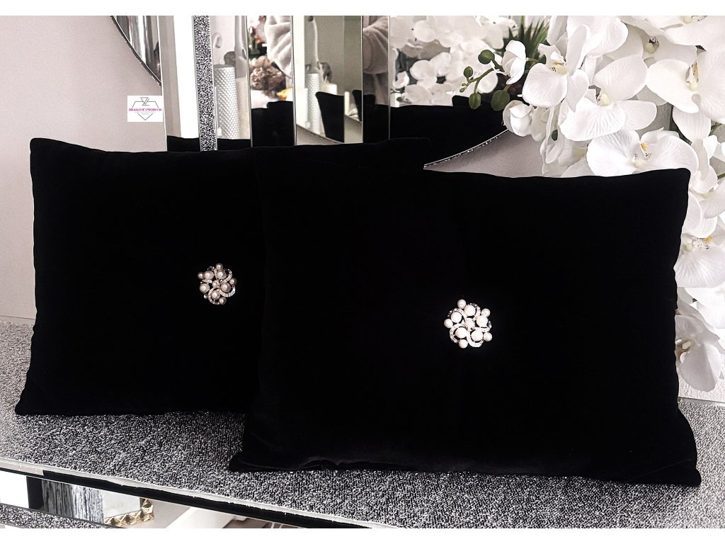 Zamatový dekoračný vankúš v čiernej farbe s luxusnou brošňou v strede, rozmer 42x32 cm. Elegantný doplnok s mäkkou výplňou z dutého vlákna.
