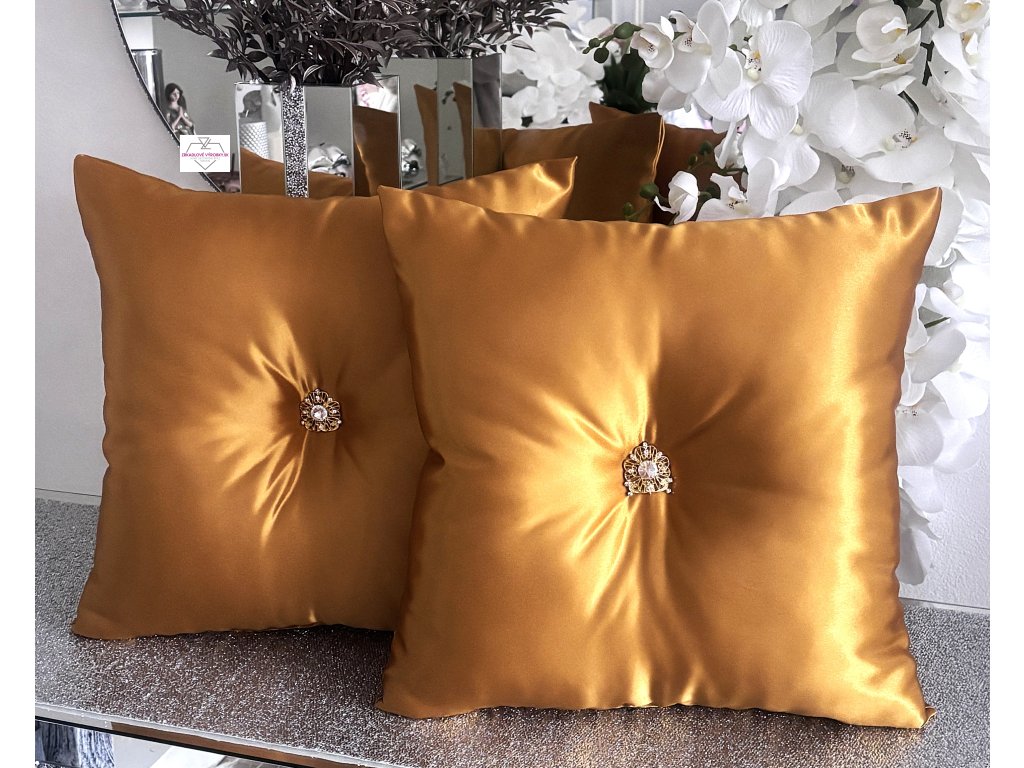 Zlatý dekoračný vankúš s elegantnou brošňou. Rozmer 44×44 cm, mäkká výplň a štýlový doplnok do obývačky, spálne či kancelárie.