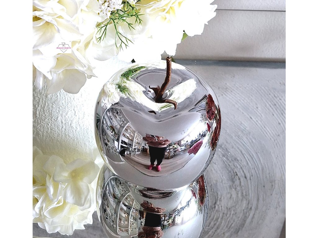 Strieborné keramické jablko, rozmer 10×12 cm. Elegantná dekorácia s luxusným vzhľadom, ktorá dodá interiéru štýl a moderný šmrnc.
