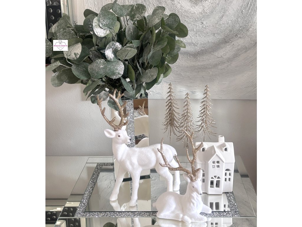 Elegantný zamatový jeleň v bielej farbe so zlatými parohmi je dokonalým doplnkom do moderného aj glamour interiéru. Jeho jemný zamatový povrch pôsobí luxusne a v kombinácii s trblietavými detailmi vytvorí jedinečnú sviatočnú atmosféru.