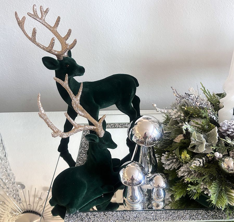 Elegantný zamatový jeleň v tmavozelenej farbe so zlatými parohmi je dokonalým doplnkom do moderného aj glamour interiéru. Jeho jemný zamatový povrch pôsobí luxusne a v kombinácii s trblietavými detailmi vytvorí jedinečnú sviatočnú atmosféru.