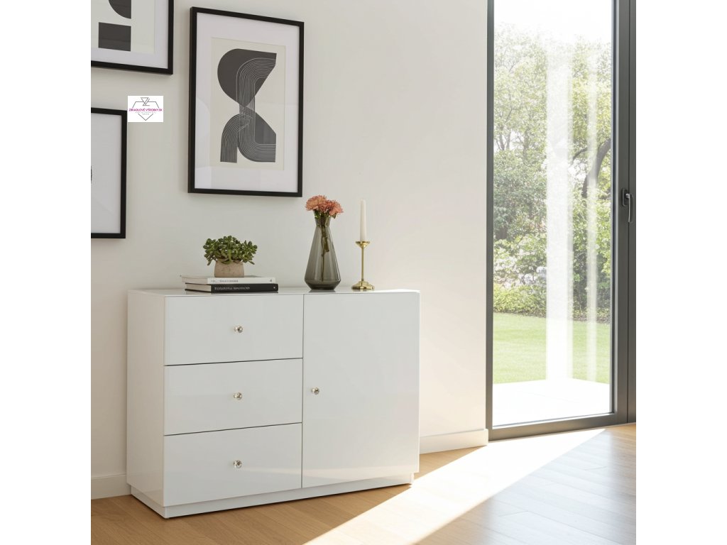 Táto komoda v bielom skle vynikne najlepšie v svetlom a jemnom interiéri, kde jej čistý dizajn zostane dominantný bez rušivých prvkov.
