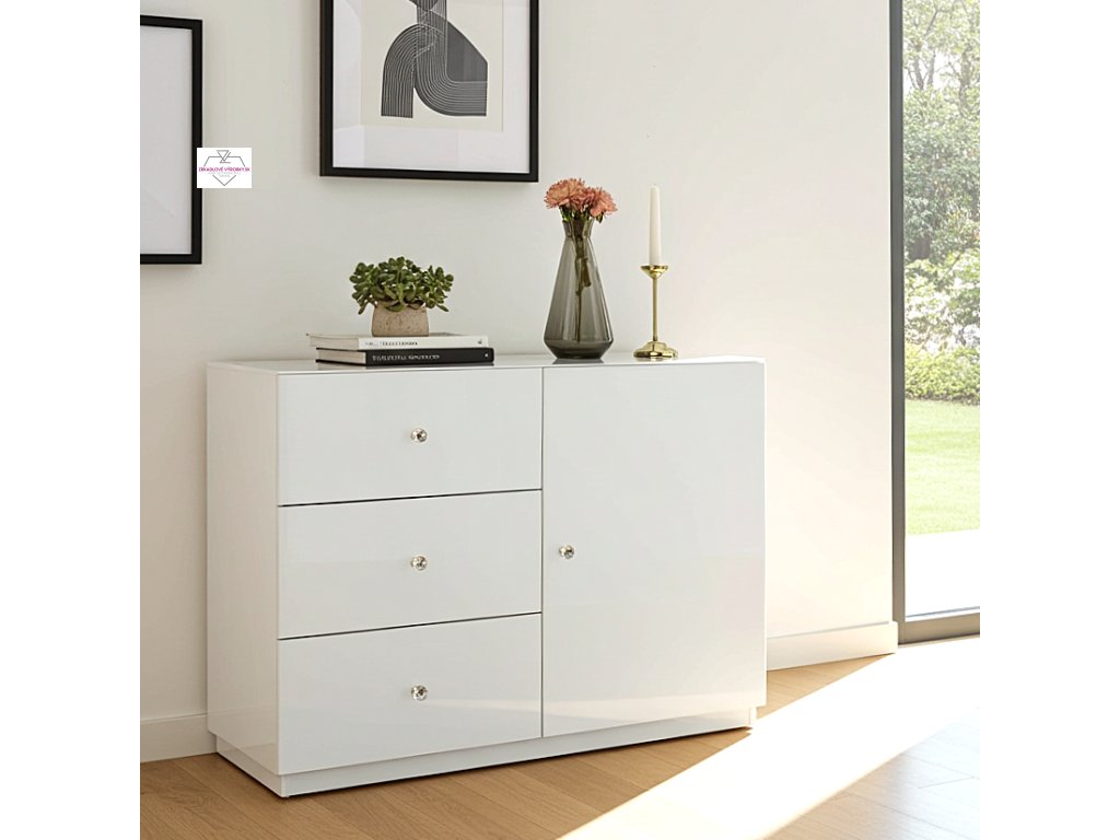 Elegantná komoda v bielom skle s krištáľovými úchytkami rozjasní interiér a dodá mu jemný luxusný vzhľad.
