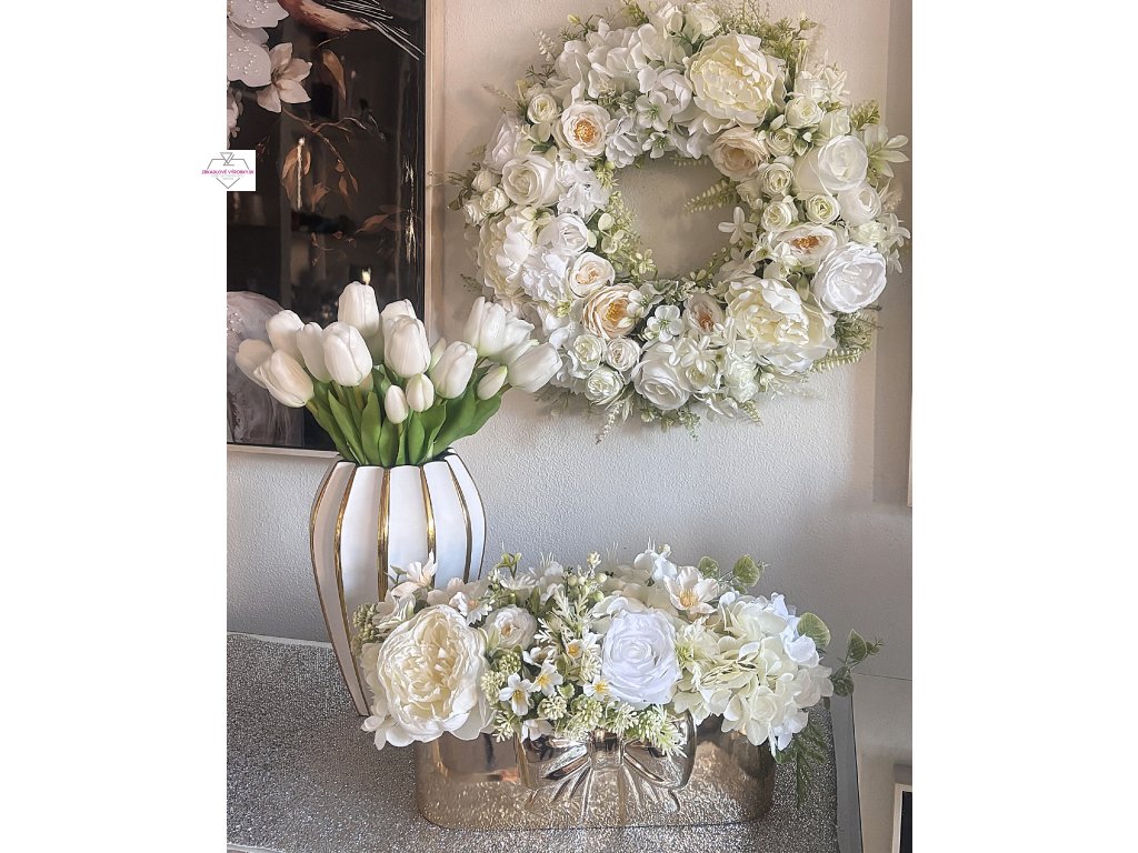 Luxusný kvetinový aranžmán v zlatej keramickej nádobke je elegantná dekorácia, ktorá dodá každému interiéru štýl, jemnosť a nádych luxusu. Harmonická kombinácia bielych a krémových kvetov vytvára prirodzený a nadčasový vzhľad, ktorý krásne vynikne v moderných aj klasických priestoroch.