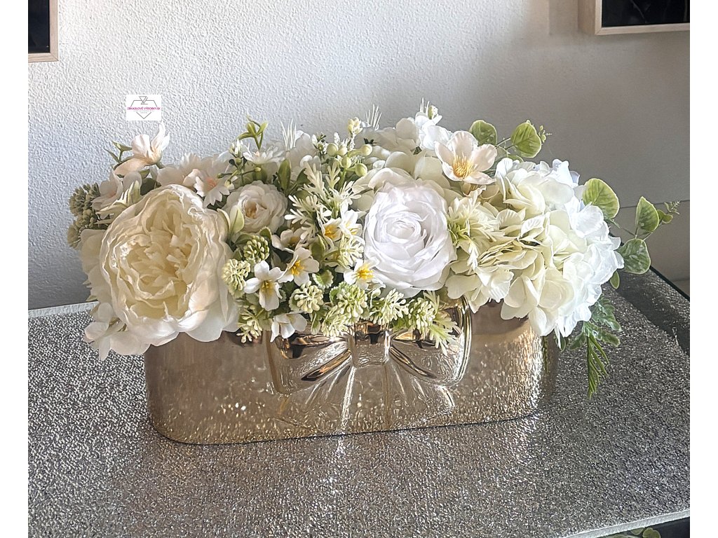 Farba: zlatá nádoba, biele a krémové kvety
