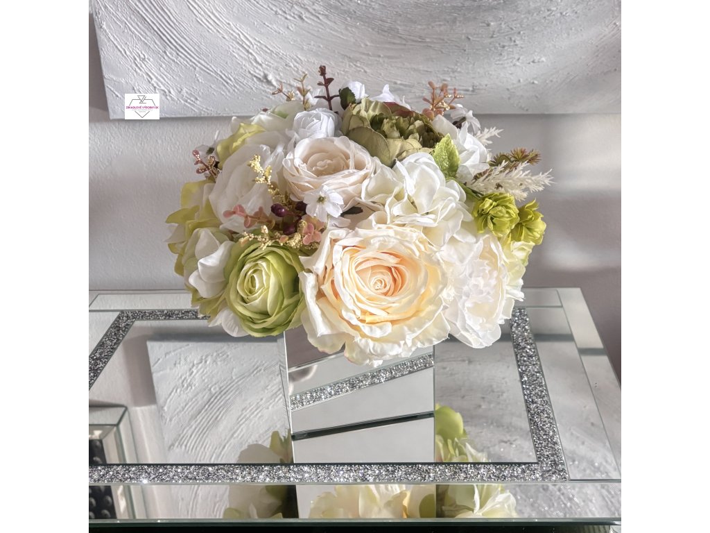 Zrkadlová váza s bielo-zeleným aranžmánom premení každý priestor na oázu harmónie. Luxus, jemnosť a sviežosť v jednom elegantnom doplnku.
