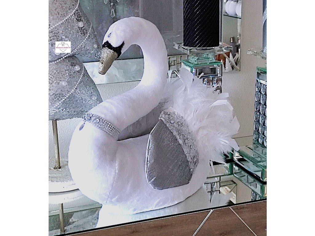 Bielo-strieborná dekoračná labuť 36×35 cm – elegantný doplnok z našej výroby, ktorý dodá interiéru luxus, jemnosť a trblietavý glamour efekt.