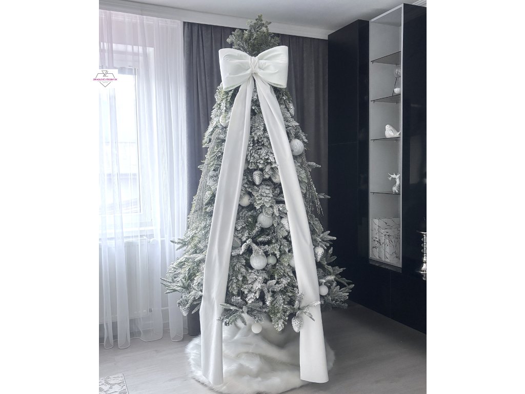 Zamatová biela mašla na stromček vo výraznej veľkosti. Hebký materiál a elegantný tvar dodajú výzdobe pôsobivý a harmonický vzhľad.