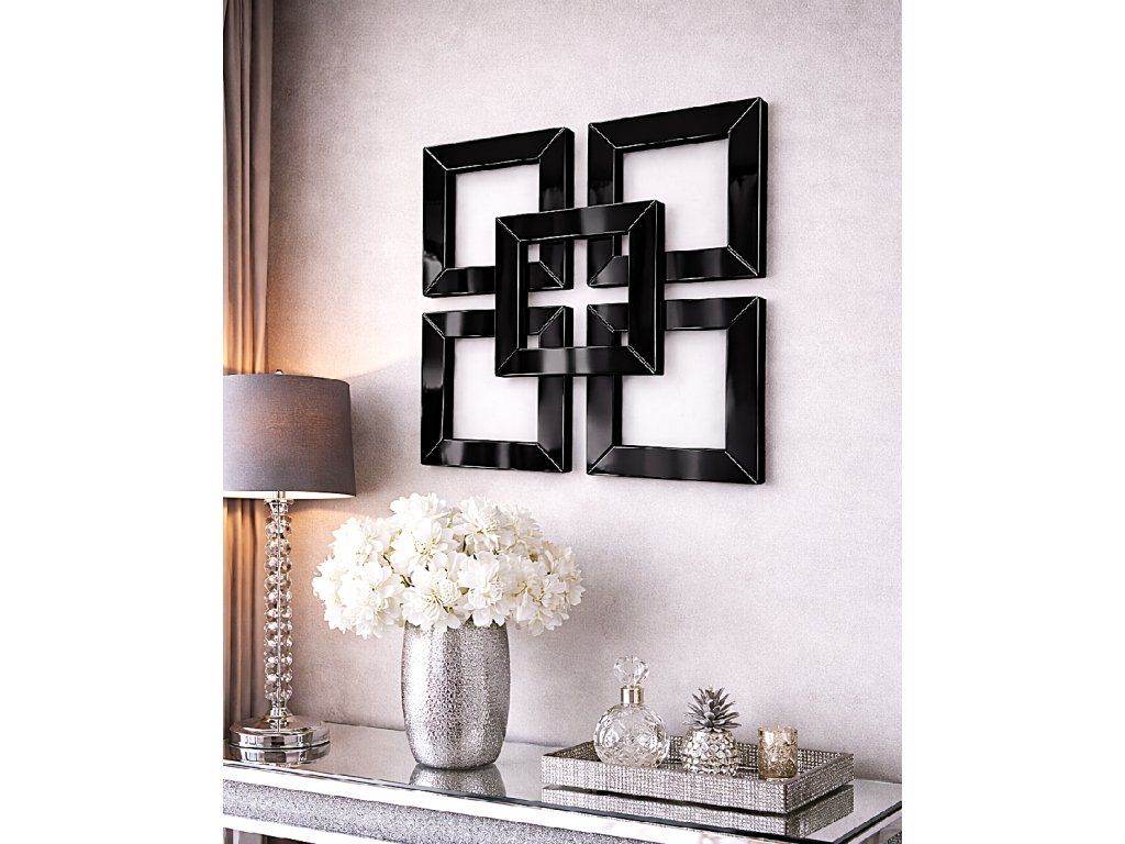 Luxusná nástenná dekorácia z čierneho skla predstavuje výrazný dizajnový prvok, ktorý okamžite pritiahne pozornosť a dodá priestoru moderný charakter. Kompozícia piatich prepojených štvorcov vytvára zaujímavý geometrický efekt, ktorý pôsobí elegantne a zároveň dynamicky.