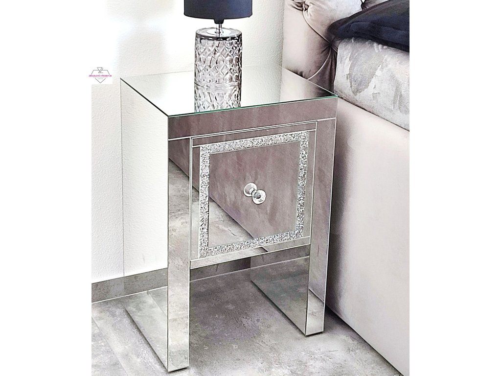 Štýlový nočný zrkadlový stolík so zásuvkou,zdobený striebornými kamienkami a zásuvkou.
