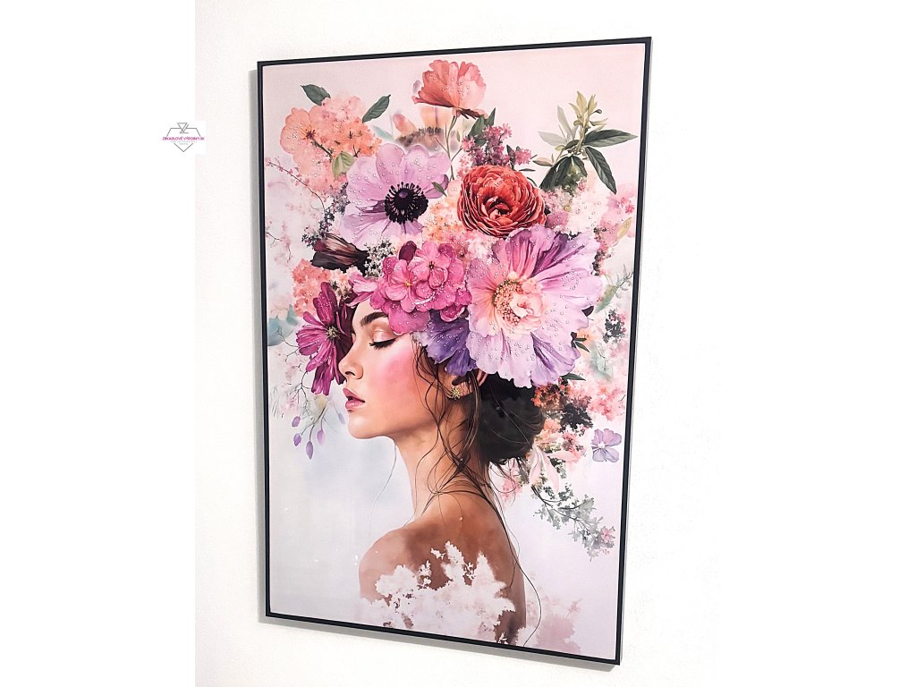 Elegantný a výrazný obraz zobrazujúci ženský profil zahalený do bohatej kvetinovej koruny v jemných ružových, fialových a pastelových tónoch. Obraz pôsobí romanticky, luxusne a zároveň veľmi moderne. Zdobenie drobnými kamienkami dodáva dielu jemný lesk a exkluzívny vzhľad, ktorý krásne vynikne pri dennom aj umelom svetle.