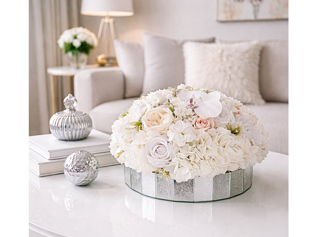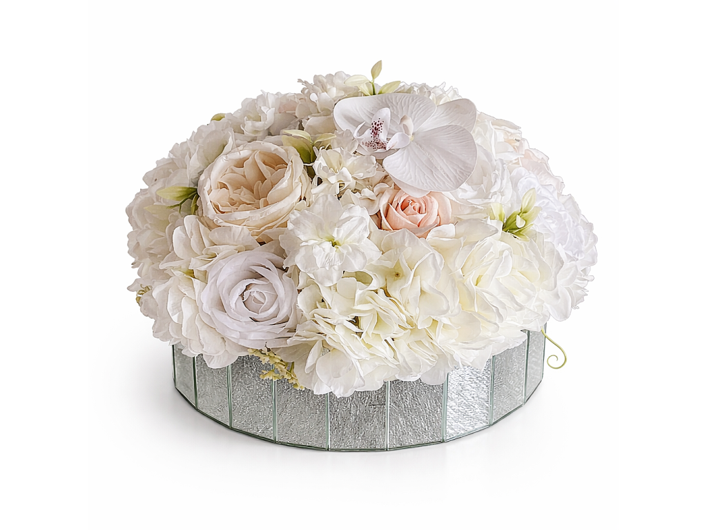 Predstavte si elegantne upravený stôl, ktorý okamžite získa jemný luxusný detail. Bielo-krémové kvety priestor zjemnia, zatiaľ čo zrkadlová nádobka odráža svetlo a dodáva dekorácii noblesný efekt.