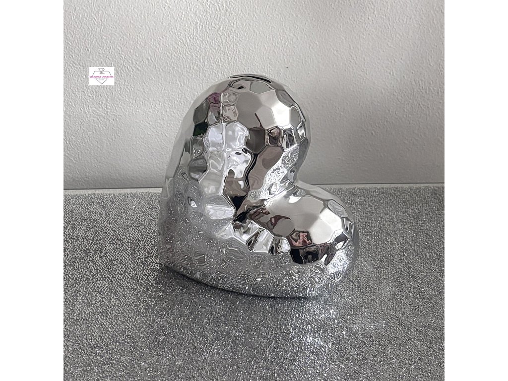 Elegantná keramická pokladnička v tvare srdca v luxusnom striebornom prevedení je krásnym symbolom lásky a zároveň štýlovou dekoráciou do moderného interiéru. Jej lesklý, zrkadlovo pôsobiaci povrch s jemne štruktúrovaným efektom vytvára originálny dizajn, ktorý okamžite upúta pozornosť.