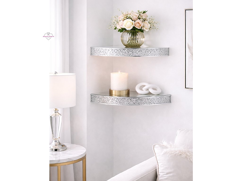 Táto rohová zrkadlová polica so striebornými kamienkami predstavuje elegantné riešenie, ako využiť priestor a zároveň mu dodať luxusný charakter.