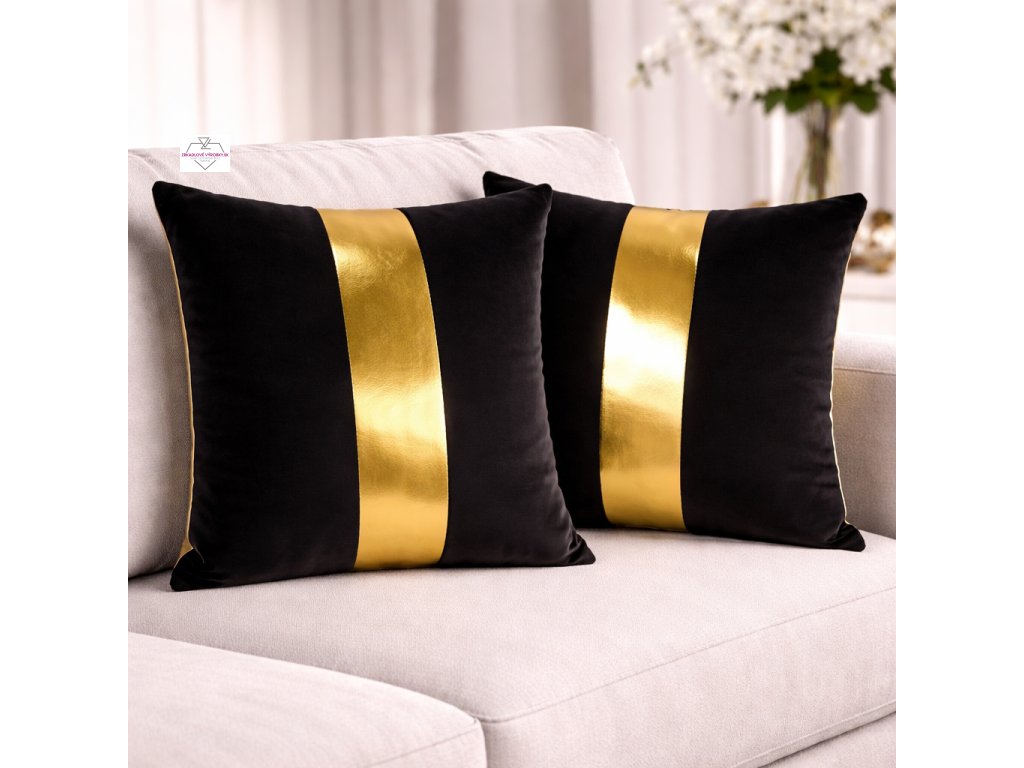 Tento zamatový poťah na vankúš v čiernej farbe so zlatým pásom predstavuje elegantný a výrazný doplnok, ktorý dodá interiéru moderný luxusný charakter.