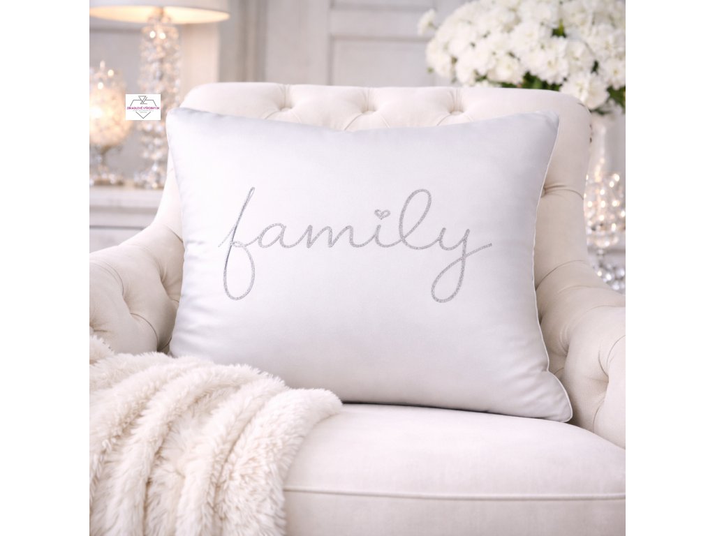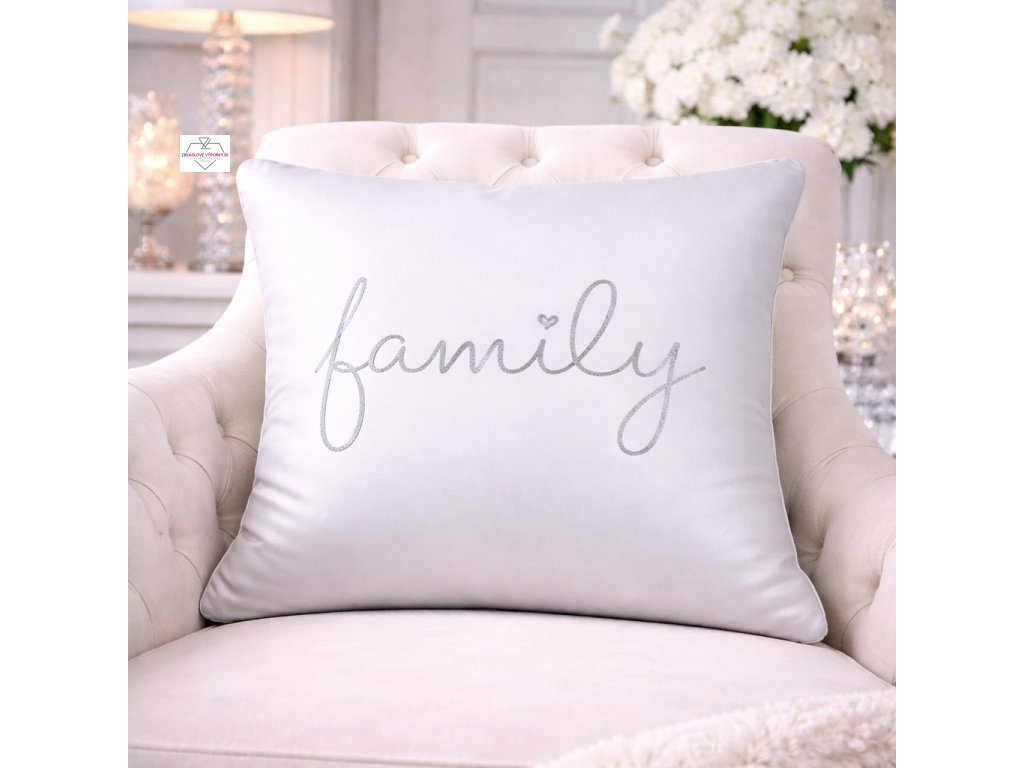 Saténový poťah na vankúš so strieborným nápisom Family 45×45 cm – elegantný doplnok, ktorý dodá vášmu domovu teplo, štýl a luxusný vzhľad.