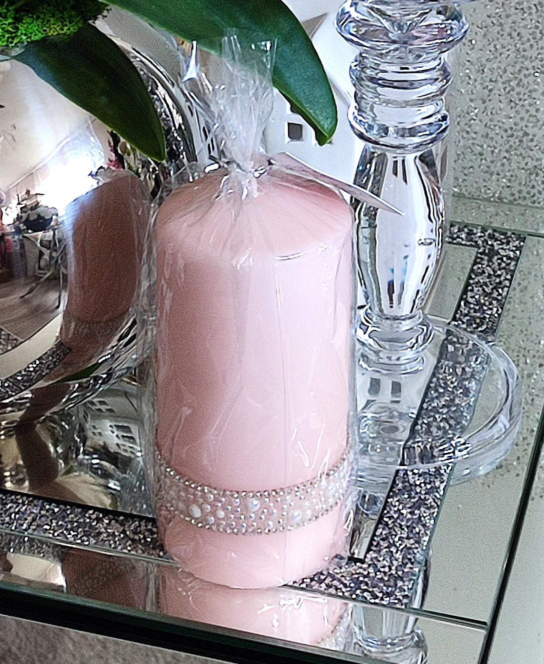 Elegantná ružová sviečka zdobená jemnými perličkami dodá priestoru romantický a vkusný vzhľad. Je ideálnym doplnkom pre sviatočné dekorácie, svadobné výzdoby alebo ako ozdoba do interiéru v jemných tónoch.