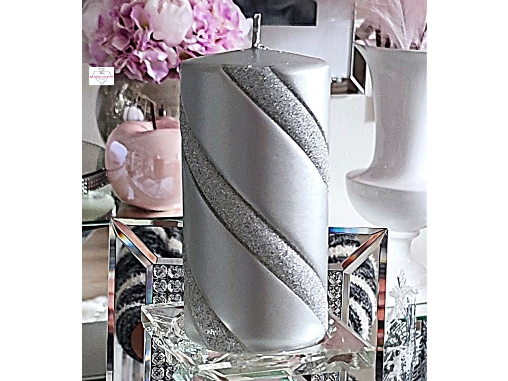 Sviečka v elegantnom sivo-striebornom prevedení so vzorom je ideálnym doplnkom pre moderný aj glamour interiér. Jej decentný lesk a jemný dizajn vytvárajú luxusnú atmosféru. Skvelo sa hodí na sviatočný stôl, komodu či ako darček. Pri horení nesteká a zachováva si svoj tvar.