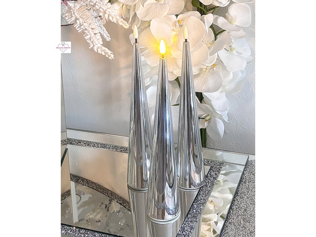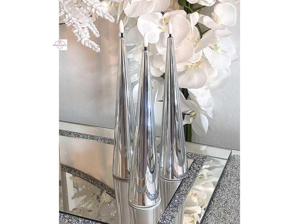 Dopraj si svetlo, ktoré nikdy nevyhasne. Táto strieborná LED sviečka v tvare kužeľa spája eleganciu, bezpečnosť a moderný dizajn. Je ideálnym doplnkom pre zrkadlové a glamour interiéry, v ktorých vynikne svojím jemným leskom a realistickým svetelným efektom.
