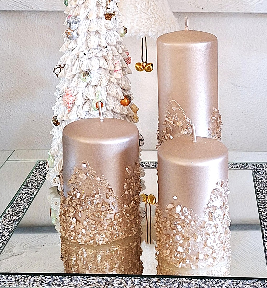 Sviečky trio v hnedo-púdrovo perleťovej farbe s jemným kryštálovým efektom. Elegantná dekorácia pre vianočné i celoročné aranžmány. Vytvorte teplú a útulnú atmosféru.