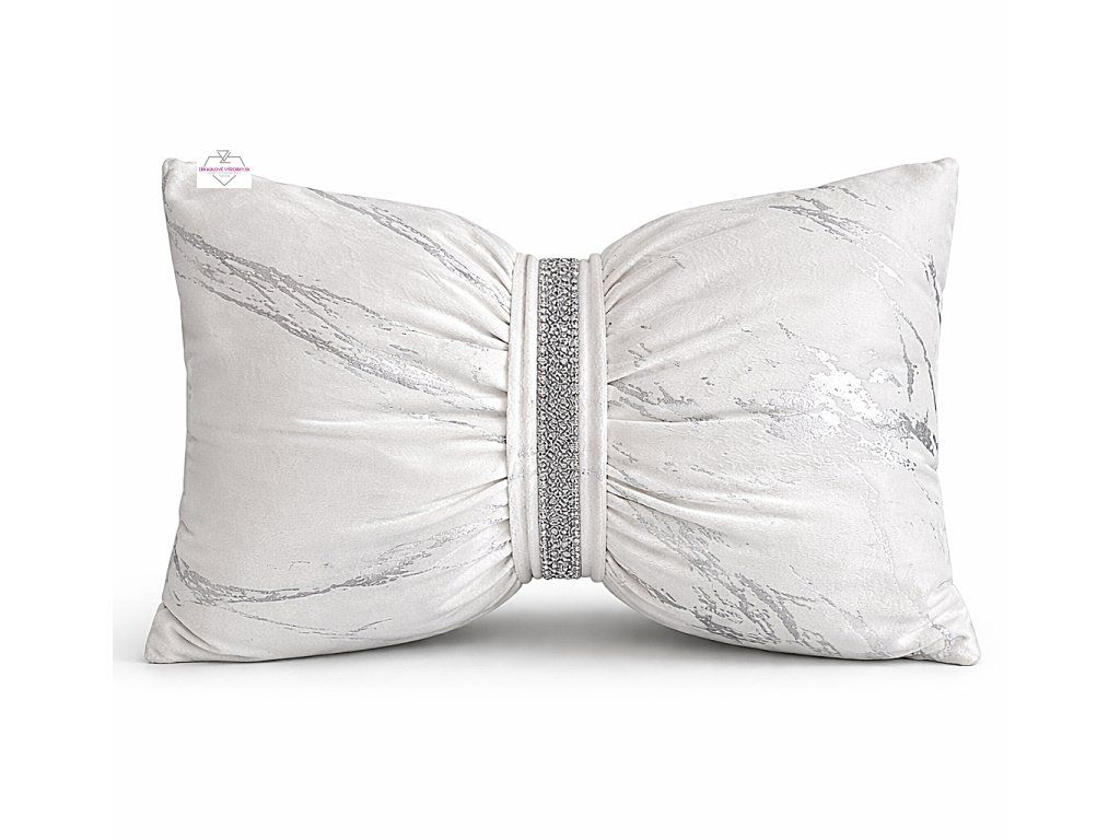 Elegantný zamatový vankúš v tvare mašle so strieborným zdobením. Štýlový doplnok, ktorý dodá interiéru luxusný vzhľad.