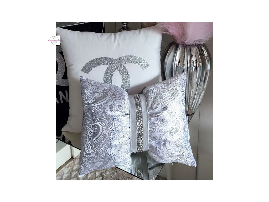 Dekoračný vankúš v tvare mašle v štýle glamour, rozmer 40x28 cm. S odnímateľnou ozdobnou čelenkou s kamienkami, zapínanie na zip.