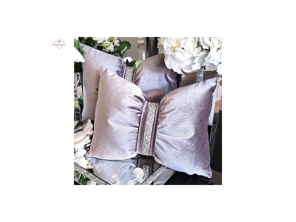 Sivý zamatový dekoračný vankúš v tvare mašle s trblietavým pásikom, rozmer 42x32 cm. Mäkký, hebký a elegantný doplnok pre glamour interiér.