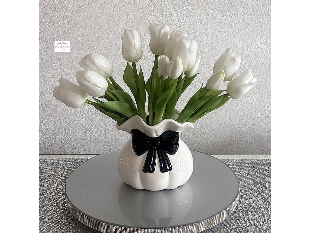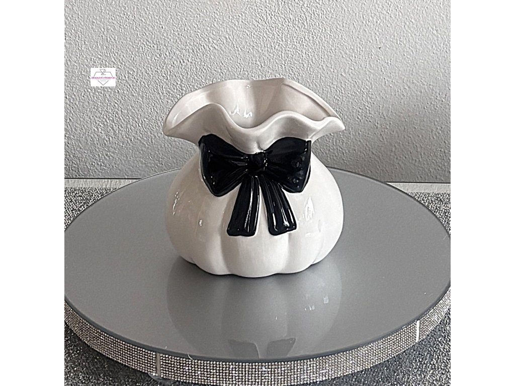 Elegantná biela váza s čiernou mašľou s rozmermi 18 × 15 cm. Luxusná dekorácia do moderného a glamour interiéru s výrazným dizajnom.