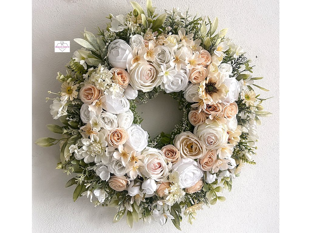Nádherný kvetinový venček s priemerom 50 cm v jemných bielo-krémových tónoch, ktorý dodá domovu eleganciu, útulnosť a nadčasový štýl po celý rok.