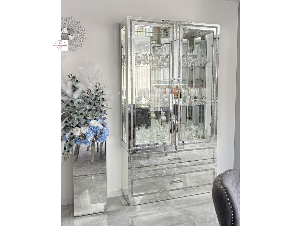 Zrkadlová presklená vitrína so zásuvkami v rozmere 170x100x40 cm je výnimočný kus nábytku, ktorý spája eleganciu, funkčnosť a žiarivý dizajn. Predná časť je zdobená striebornými kamienkami, ktoré krásne odrážajú svetlo a dodávajú interiéru luxusný charakter.