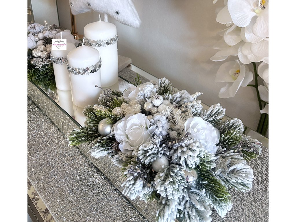 Elegantný zimný aranžmán so sviečkami v zrkadlovej nádobe je dokonalým doplnkom pre váš interiér počas zimných mesiacov. Kombinácia umelých bielych kvetov, zasnežených vetvičiek a strieborných ozdôb vytvára nádherný, harmonický celok. Vďaka zrkadlovému podstavcu pôsobí luxusne a rozžiarí každý priestor – či už komodu, jedálenský stôl alebo vstupnú konzolu. Dĺžka aranžmánu je 66 cm.